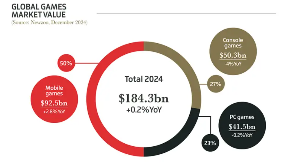 根据报告数据显示,移动端游戏收入占电子游戏总收入的比例已突破70%,远超传统PC和主机平台。这一数据表明,移动端已成为行业增长的主要驱动力,也意味着开发商和发行商在产品布局上必须更加重视移动端市场。